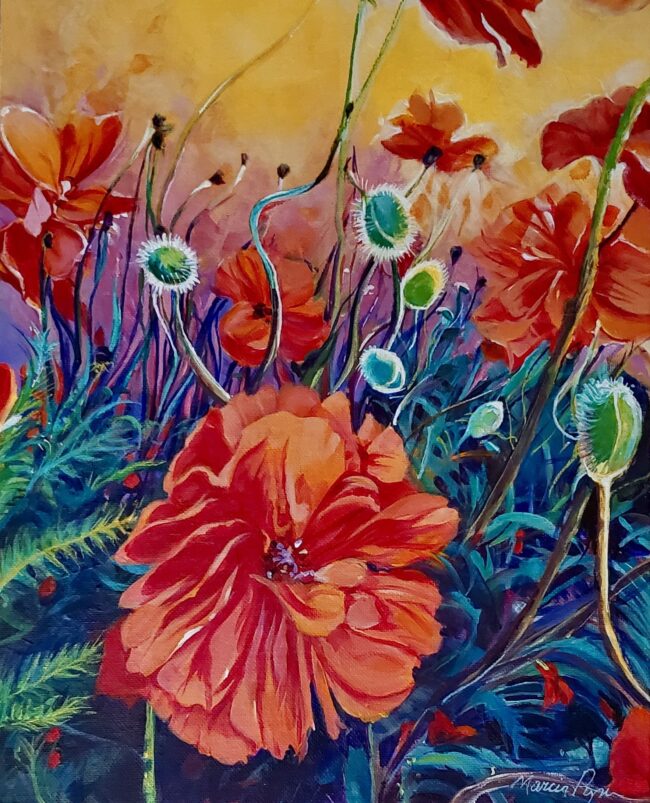 “A Blaze of Glory” Framed and available for purchase Acrylic with rice paper, 16″ x 20″